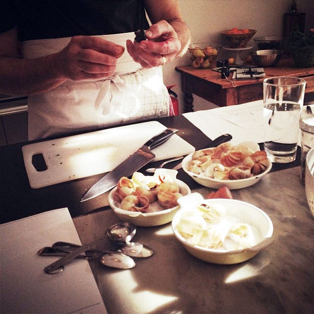 While we're chopping up bunches of fresh herbs and mincing the season's fresh spring garlic shoots, grating the nutmeg and such, I always like to slice a naked escargot into pieces, to be tasted alone before we stuff the rest into the shells with the prepared butter and pop them under the broiler. There is a silence that falls across the kitchen when I pass out the escargot forks. I explain that it's very important to taste now, that any well prepared escargot de Bourgogne is going to taste fresh and earthy, that it's going to give us something very special: In fact, when we put them into our mouths, we are reminded of just what it tastes like, the terroir of this rich and varied land.